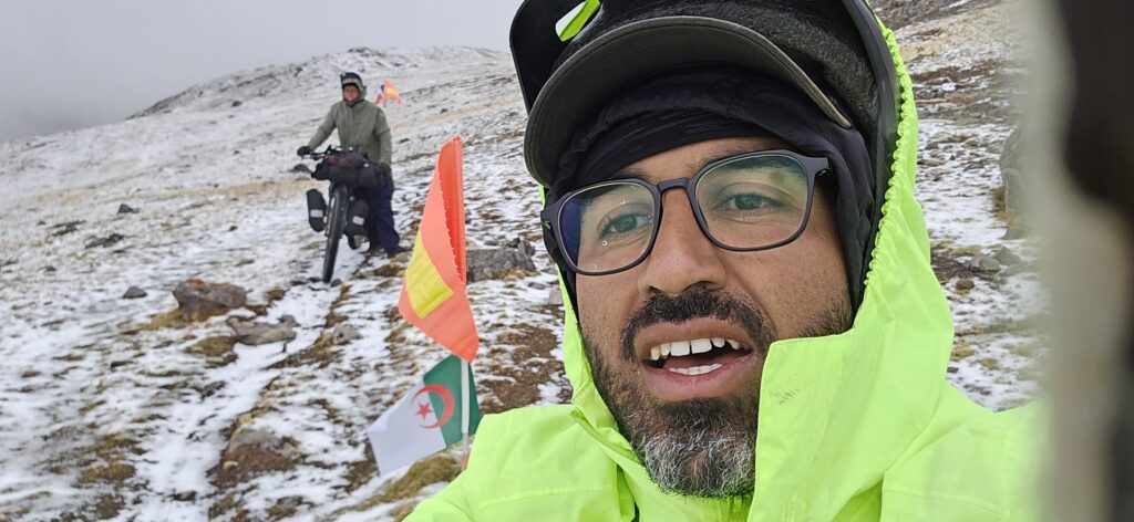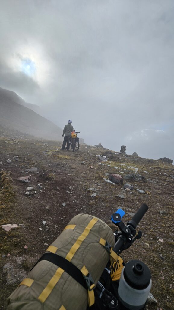 Par moment, je (Cassandre) suis prise d’angoisses : aucun plat autour de nous, aucun moyen de poser la tente, la nuit va tomber, la neige va potentiellement s’en venir, le sentier déjà si difficile à repérer par moment va disparaître. Et la roche éboulée sur notre gauche, on en parle? La peur me fait avancer. Je pousse Karim qui manque d’air, qui commence à plier sous les efforts immenses déployés lors des poussées des vélos. Car même si on poussait à 2, il était à l’avant, au guidon, donc à devoir soulever l’avant pour passer les immenses roches. Je le pousse: « allez, on doit passer ce putain de col, lâche pas ».