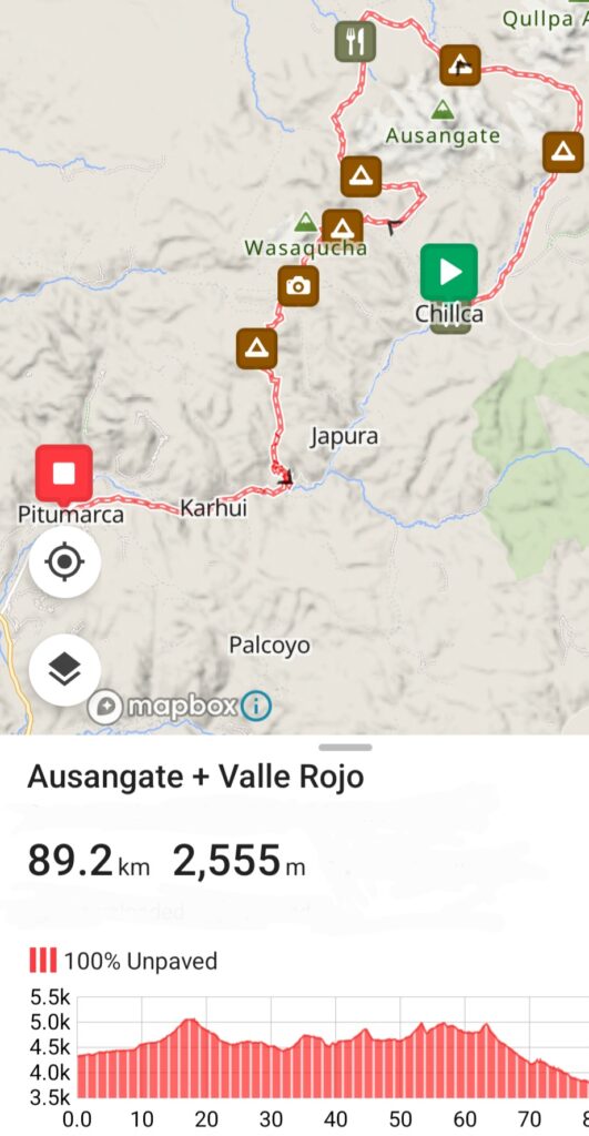 Ça, c’est la théorie: 89km autour du Nevado Ausangate et une descente vers Rainbow Mountain (Vinicunca) et la Valle Rojo. 3 cols à 5000m d’altitude à passer: Campa pass, Apuchata pass et un troisième. Un hike-a-bike noté 8/10 sur le site de bikepacking.com. 8 jours, c’est le temps qu’on s’était donné pour réaliser cette boucle.