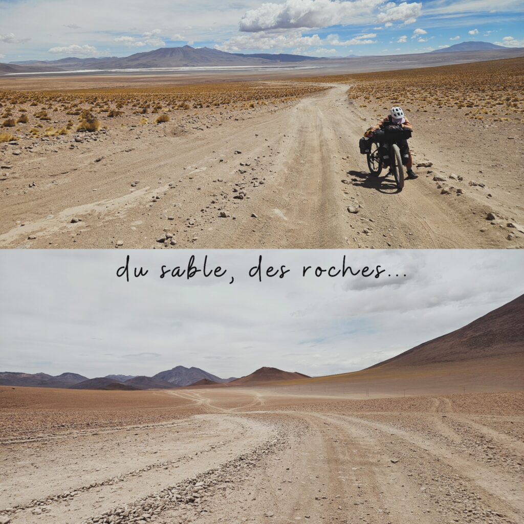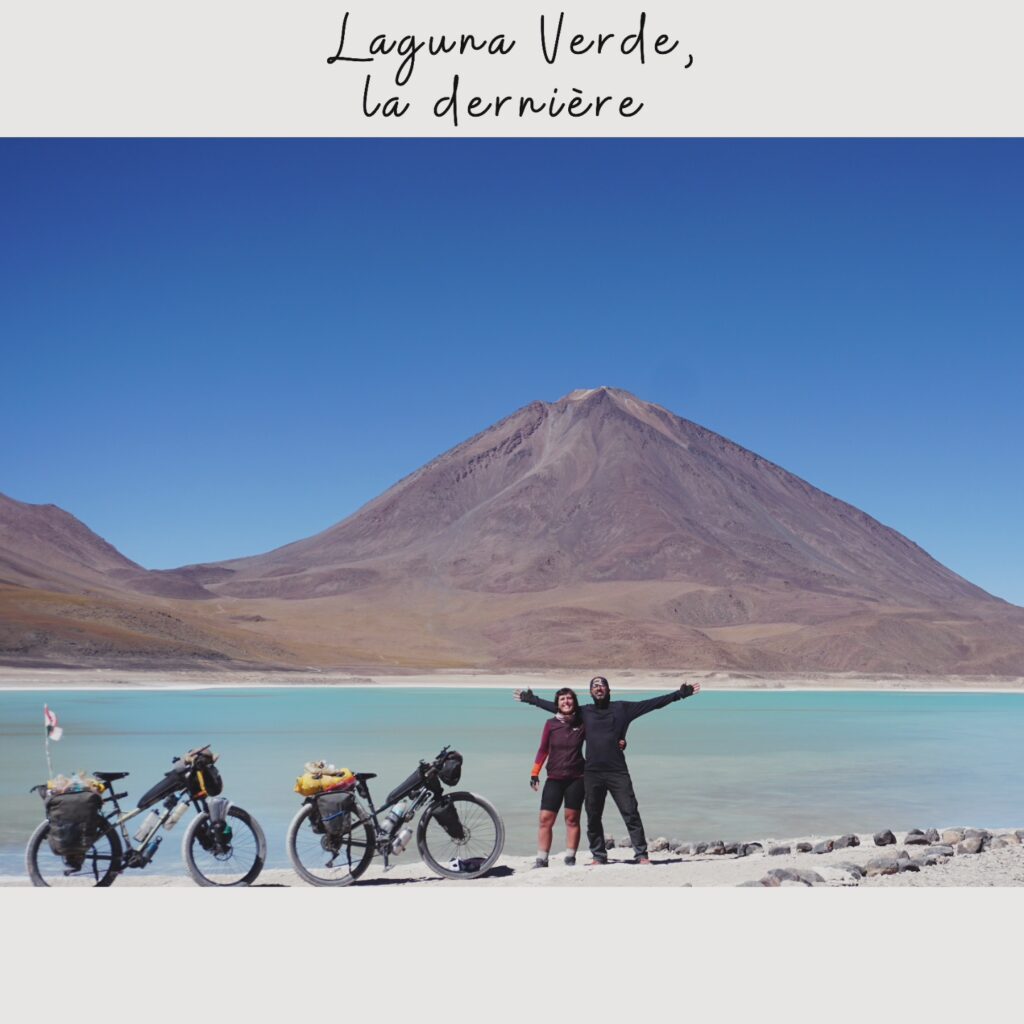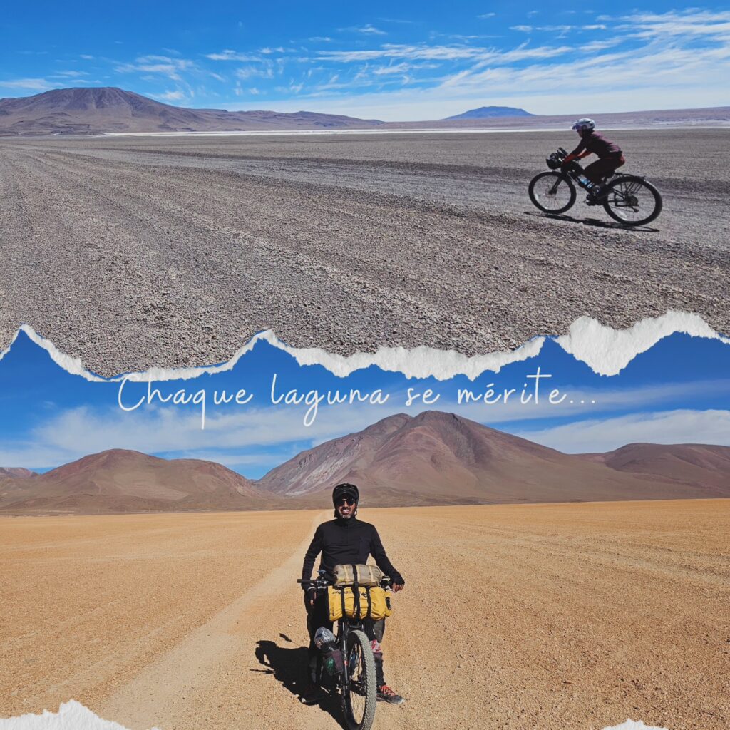 Nous avons longtemps hésité avant d’embarquer sur la Ruta de Las Lagunas. Nous oscillions entre excitation et appréhension… Le meilleur compromis a été de se rendre directement à Laguna Colorada avec une movilidad. Et nous n’avons vraiment pas regretté! Nous avons passé 3 jours de Laguna Colorada jusqu’à Hito Cajon. 3 jours assez difficiles mais dans un environnement unique, grandiose et magnifique. Le vent est définitivement le pire ennemi de tout cycliste sur cette piste. Le partage de la piste avec les 4×4 peut parfois être compliqué, surtout lorsqu’ils repartent à vide et qu’ils n’ont plus aucune retenue en raison de l’absence de touriste à bord. Toutefois, tous les efforts déployés valent clairement la peine pour être dans ce désert si éloigné de tout et si unique. Nous en avons pris plein les yeux et c’est définitivement un gros coup de cœur. Nous reviendrons un jour, on l’espère !