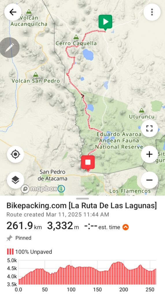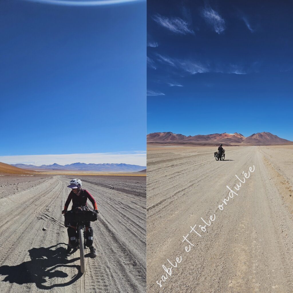 C’est un endroit très fréquenté par les 4×4 touristiques. La route est donc transformée en tôle ondulée (ou washboard) sur une grande partie. Il y a aussi beaucoup de passages de sable, d’autres très rocailleux, un fort vent à partir de 11h, des cols à presque 5000m d’altitude, etc. Il n’est pas rare qu’il neige aux Geysers de Sol mañana, endroit où la plupart des cyclistes s’arrêteront après la montée à la sortie de la Laguna Colorada. Les distances ne doivent pas être sous-estimées. Aussi, il s’agit d’un désert donc il faut être autonome en nourriture et en eau. Il existe quelques ravitaillements mais, l’ouverture est assez aléatoire et la diversité de produits, très restreinte. À Laguna Colorada et aux thermes de Polques, il y a des hôtels, certains proposent des repas pour un coût supplémentaire, ce qui permet une pause. Il est préférable de ne pas arriver trop tard aux hôtels car ils sont souvent complets.