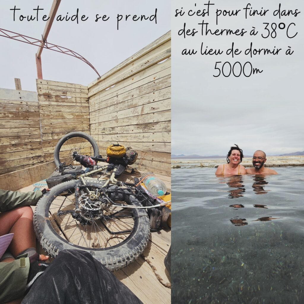 – la 2e option, celle pour laquelle nous avons opté, consiste à faire du stop dans le rond-point à la sortie d’Uyuni entre 15h et 19h. En effet, des chauffeurs partent à vide pour aller chercher des touristes le lendemain à la sortie du Sud Lipez, à la frontière Hito Cajon. Certains passent la nuit à Laguna Colorada, d’autres aux thermes. Ils peuvent alors charger les vélos sur le toit et prendre des passagers, en échange d’un surcoût bien évidemment. Ces 4×4 sont appelés « movilidad ». Nous avons été pris à 16h et sommes arrivés à la Laguna Colorada vers 22h30, pour 400bob. Il est important de considérer que les chauffeurs doivent eux-mêmes payer l’essence, qu’il s’agit de leur propre véhicule et que les agences se font beaucoup d’argent sur leurs dos. Au début, lorsqu’on a entendu parler de ces movilidad, nous avions trouvé le prix abusé. Au final, en voyant la difficulté de conduire sur ces routes, les horaires intenses des chauffeurs, etc., nous avons réalisé que 400 bob n’était vraiment pas exagéré. Sur le chemin, il y a l’entrée du parc à payer, 150bob par personne, donc prévoir de l’argent comptant. Enfin, en choisissant cette option, il faut aussi être prêt à trouver un endroit où dormir et monter le campement tard dans la nuit.