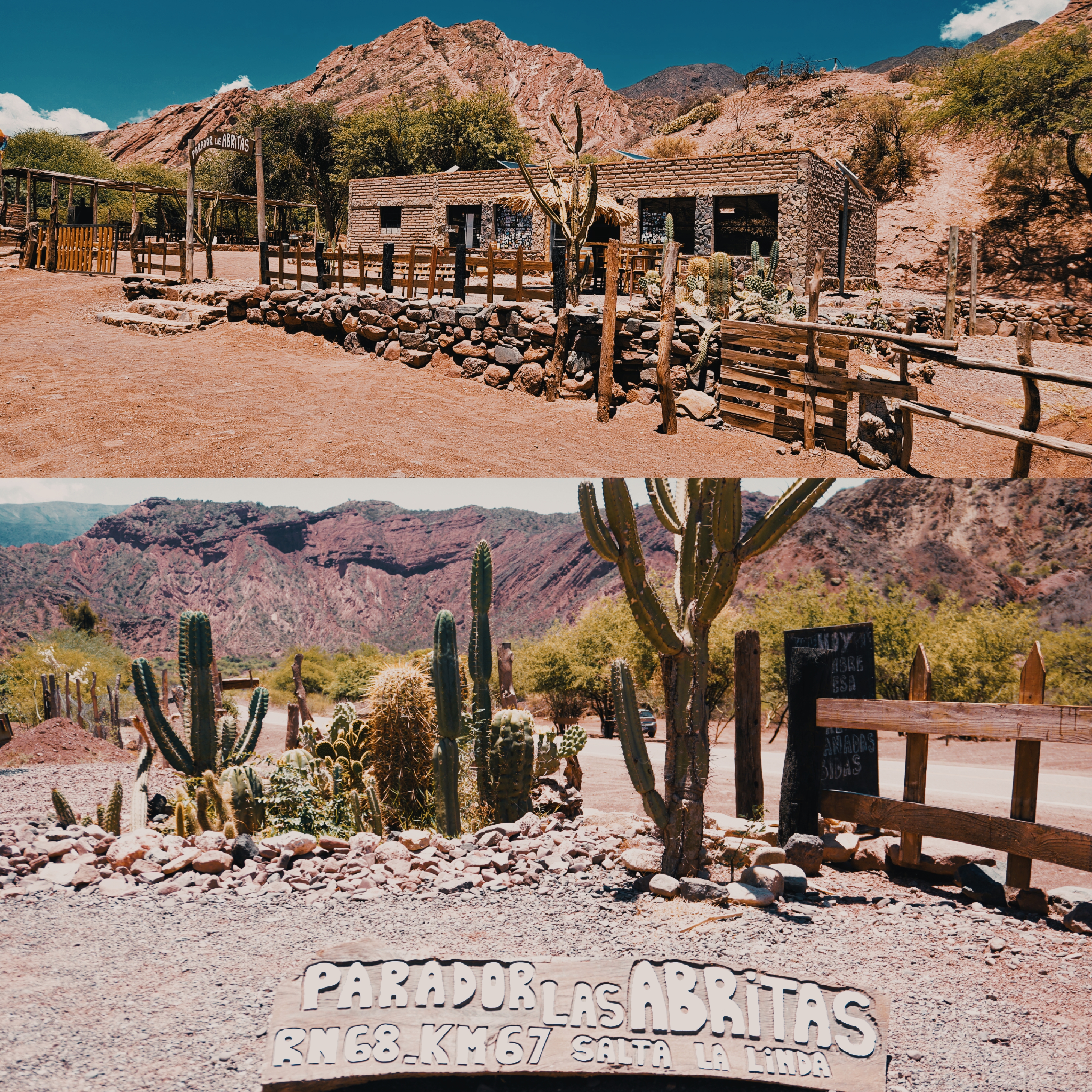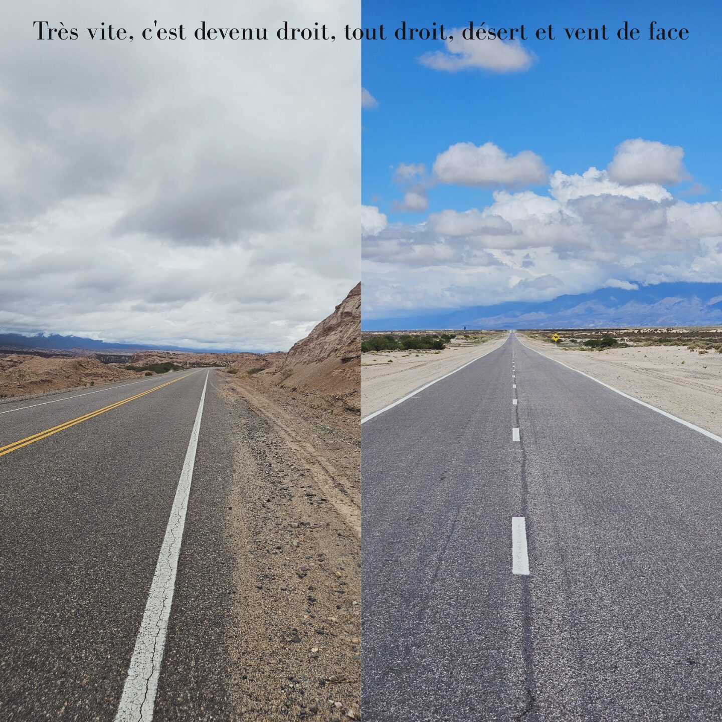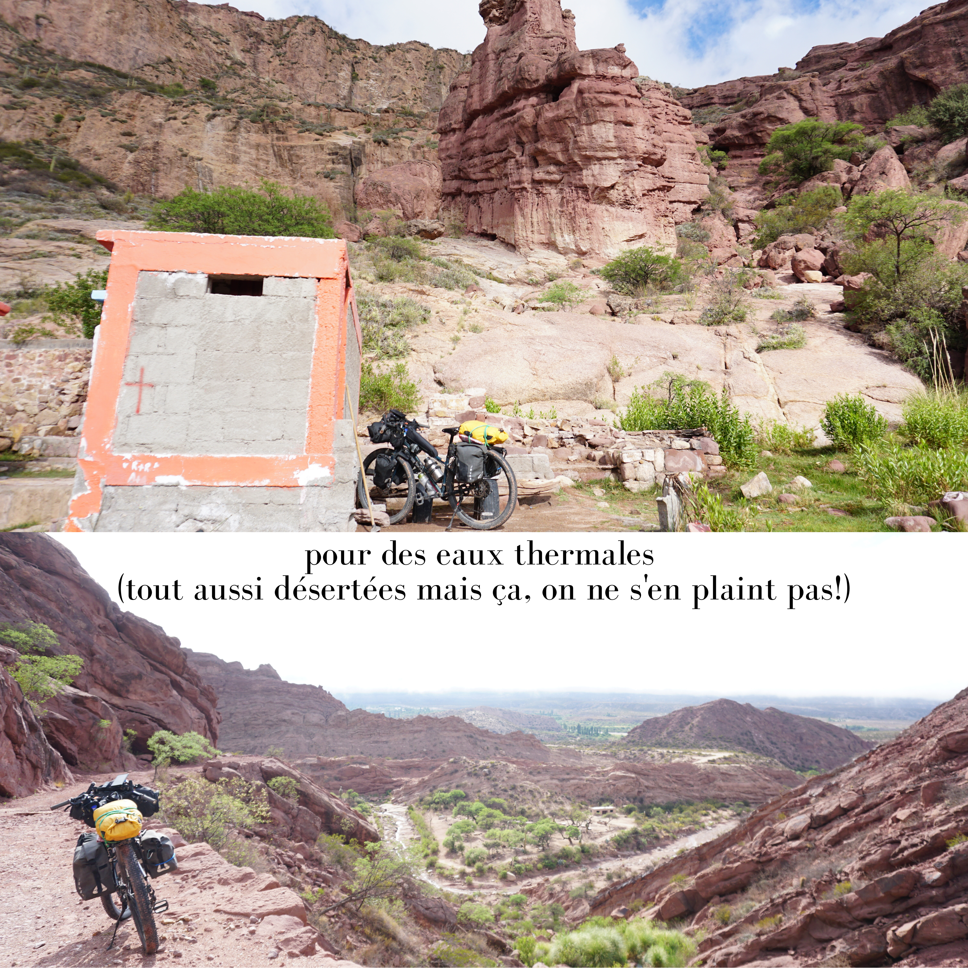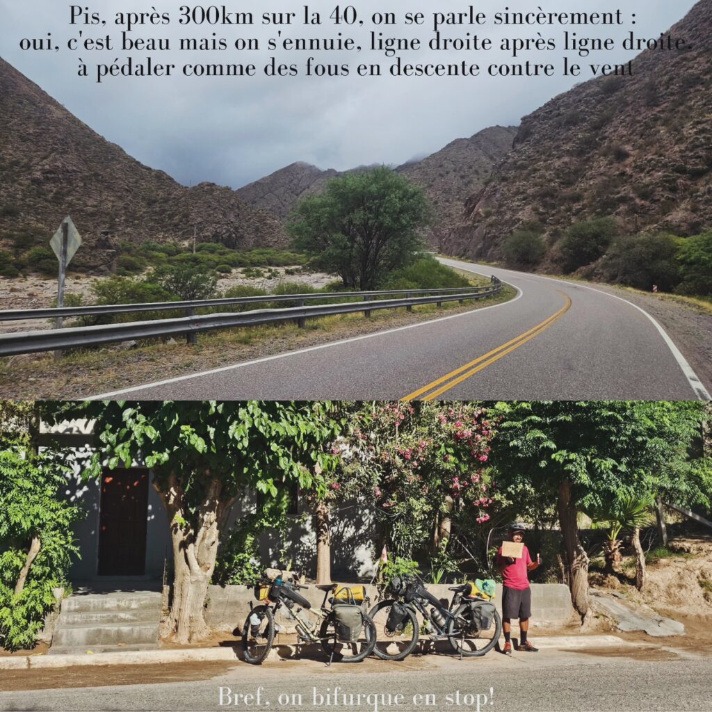Ruta 40 Cafayate à Belen: la Ruta 40, cette fameuse route mythique qui appelle au voyage… peut-être avions-nous trop d’attentes, toujours est-il qu’après 300km sur cette route, nous commencions à sérieusement nous ennuyer. Oui, les paysages sont beaux. Mais, à un moment donné, c’est toujours la même chose. Et nous nous attendions à trouver plus d’aménagements, des aires de repos, des abris du soleil, des petits villages avec cafés, restaurants, etc. Au lieu de cela, ligne droite sur ligne droite se sont succédées. À chaque pause, la difficulté de trouver de l’ombre. Dans chaque village, la difficulté de trouver de quoi se nourrir. Ce sont principalement des kioscos chez des habitants qui ont très peu de stocks et de diversité alimentaire. Enfin, le vent de face… Nous ne nous attendions pas à devoir pédaler si fort autant en montée qu’en descente. Et, après avoir parlé avec d’autres cyclovoyageurs, ce fort vent est très courant. Arrivés à Belen, nous avons décidé de ne pas continuer jusqu’à Mendoza, notre plan initial, et de faire du stop direction Córdoba. Après tout, nous ne faisons pas notre voyage pour cocher des cases… Coup de cœur tout de même pour les thermes de Los Nacimientos ❤️.