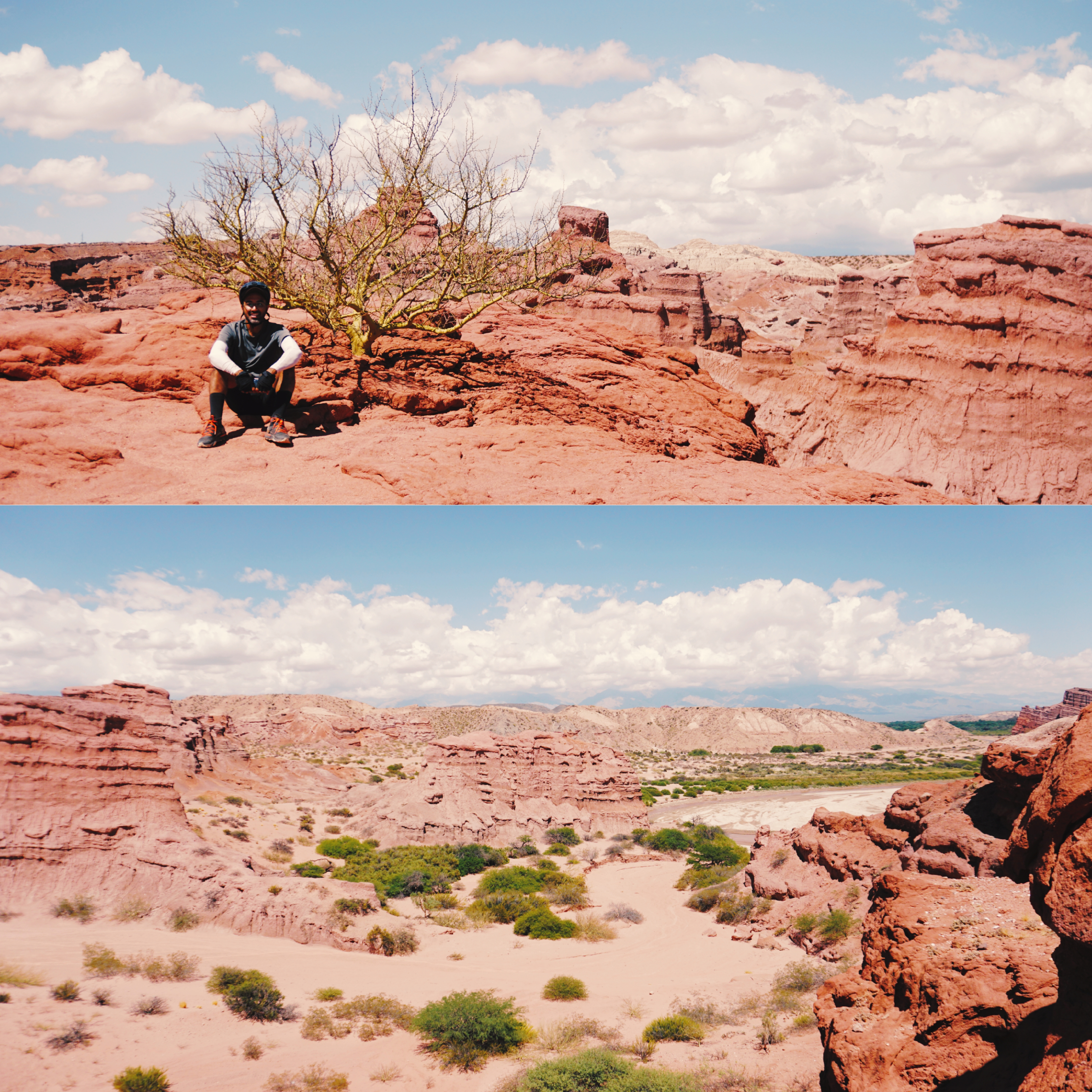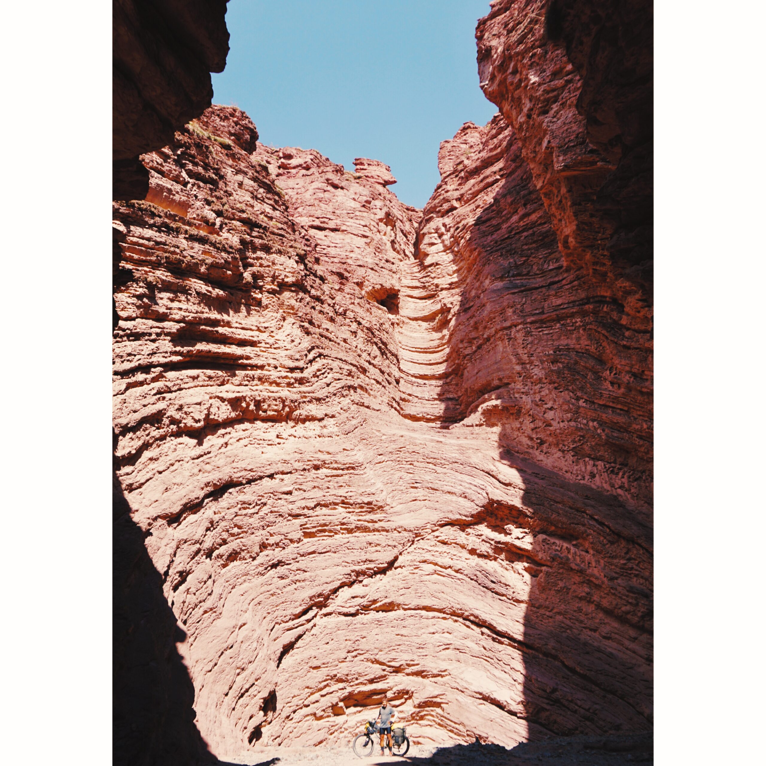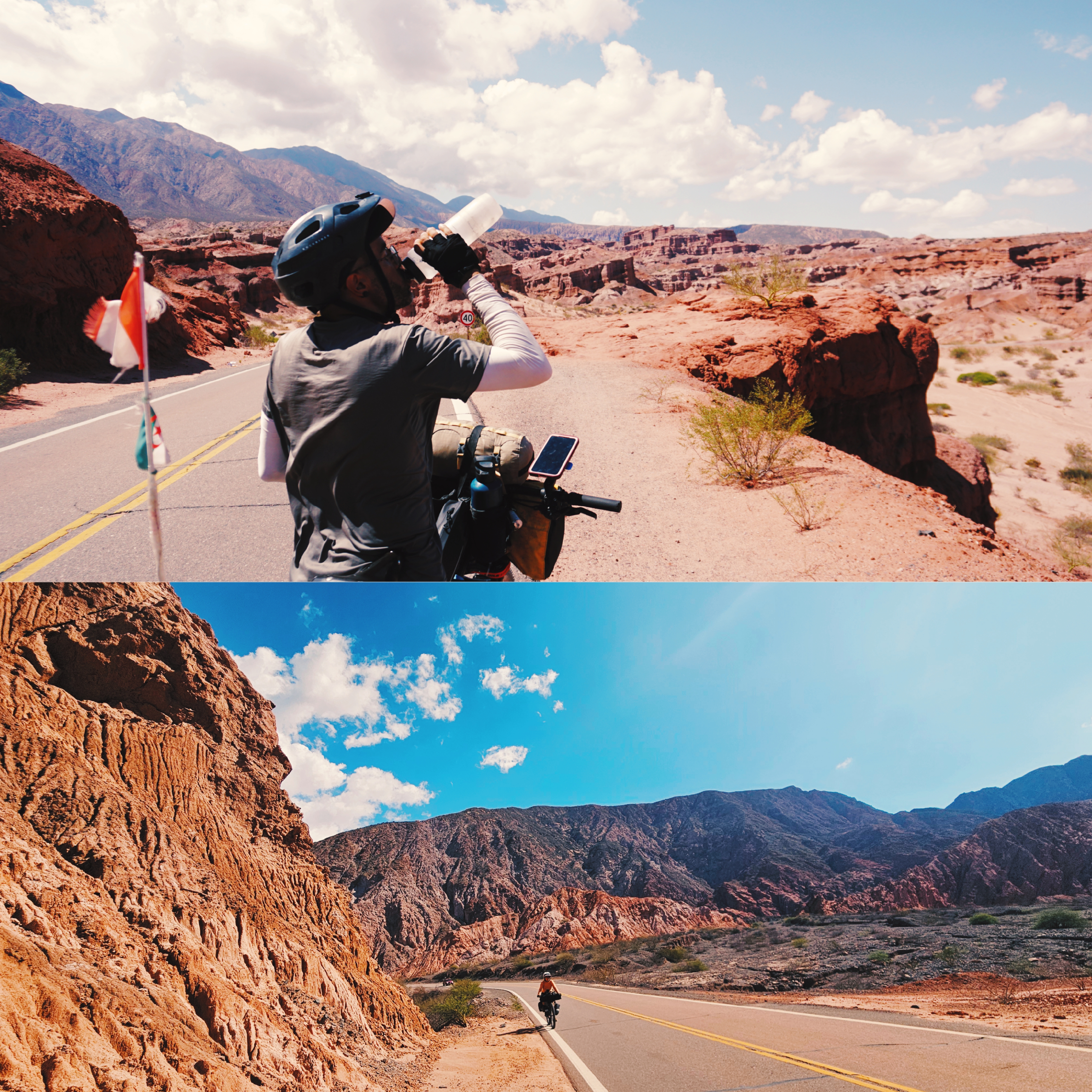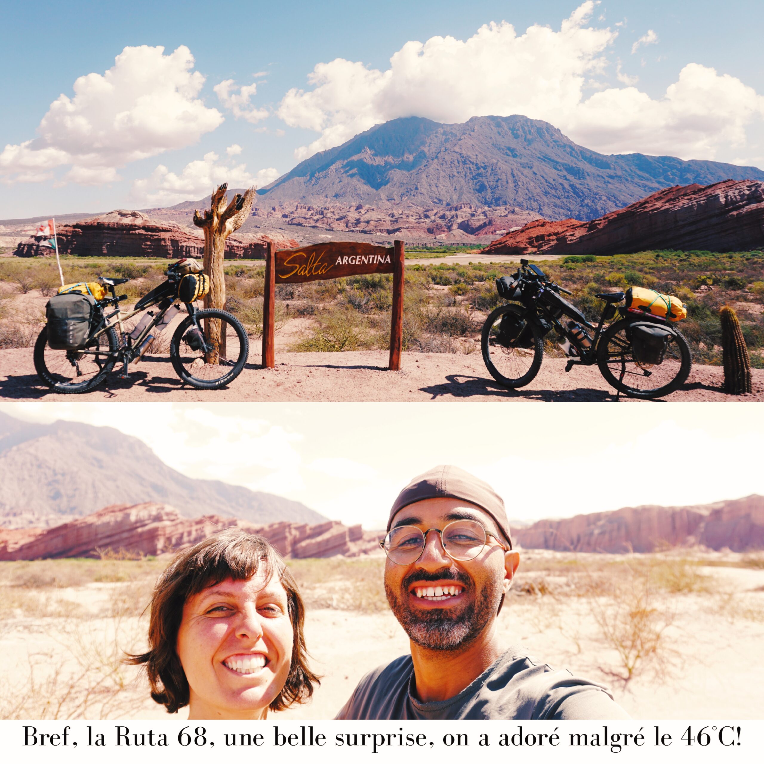 Ruta 68 Salta à Cafayate ❤️: gros coup de coeur pour cette section qui traverse la Quebrada de las Conchas. Les paysages consistent en d’imposantes formations rocheuses, sculptées par l’érosion au cours de millions d’années. Ces formations présentent différentes couleurs et formes, créant un paysage spectaculaire à traverser à vélo. Au moment de camper, il est important de prendre en considération les possibles éboulements des parois (nous en avons été témoins un soir), ainsi que les crues. Si vous parlez avec les Argentins, tous vous diront « attention aux rios »: s’il se met à pleuvoir, les rivières sortent très rapidement de leur lit et l’eau se met à ruisseler partout. Un cycliste en a fait les frais en perdant une partie de son matériel à Alemania, parce qu’il avait campé à quelques mètres du bord de la rivière. Aussi, sur la route, vous verrez les traces des crues précédentes, très impressionnantes. Il est donc recommandé de ne pas dormir trop proche du bord de la rivière.