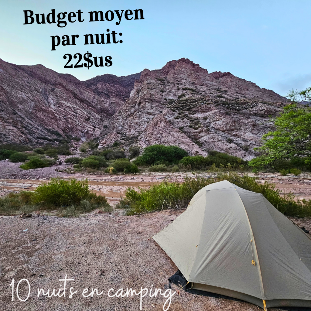 Notre budget pour ces 7 mois en Amérique du sud est de 40$cad par jour pour 2 (soit 28.5$us ou 24.5€). En Argentine, il a été très difficile de tenir ce budget, entre les logements assez chers (à Purmamarca, la moyenne de la nuit tourne autour de 100$cad!) et la nourriture qui l’est tout autant.