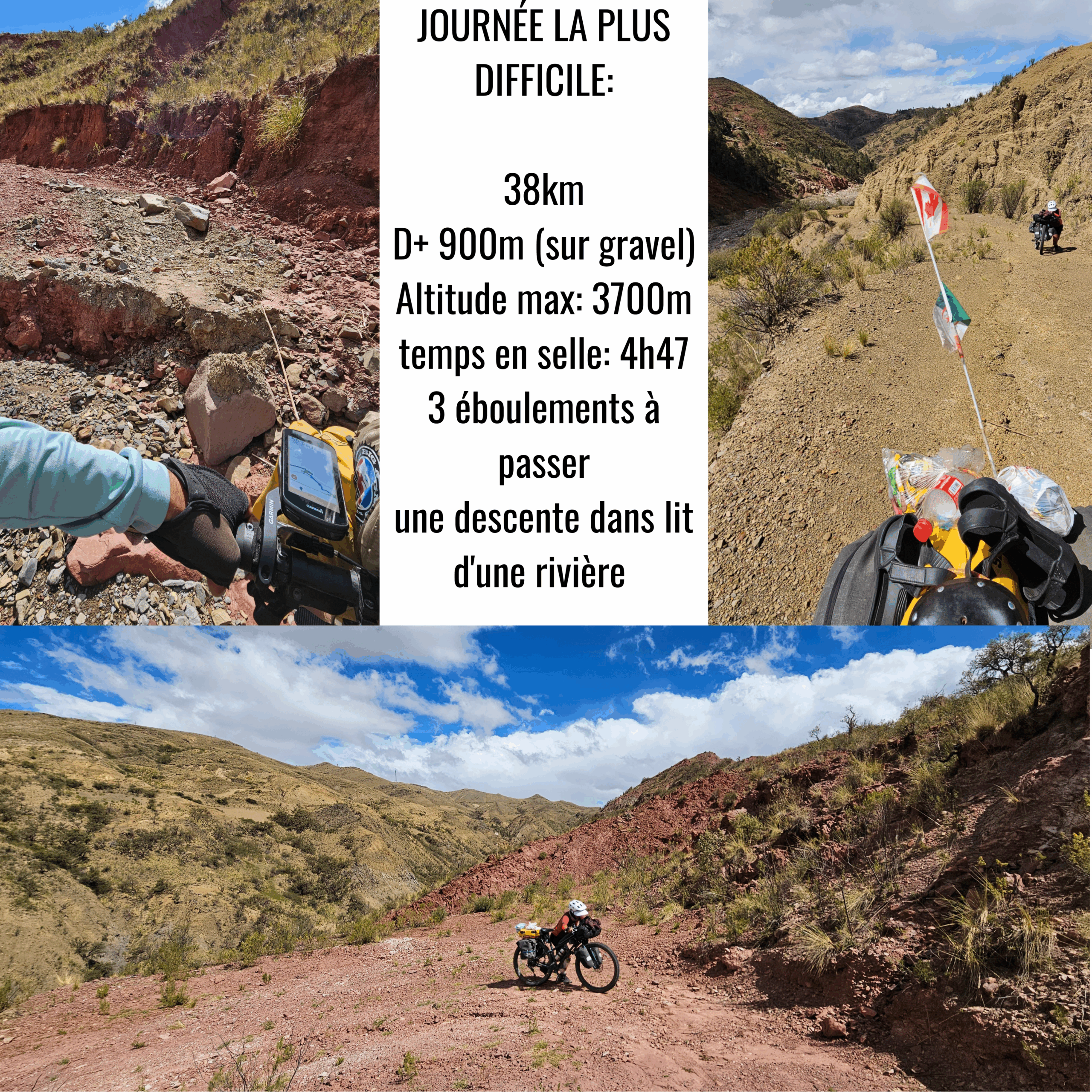 Entre Sucre et Potosi, il y a 2 options : la route principale asphaltée et le sentier qui suit l’ancien chemin de fer. Nous avions opté pour cette 2e option (traces GPS Komoot jour 55 à jour 57), où les paysages étaient incroyables mais la région, très isolée. Il fallait être autonomes en eau et en nourriture, et il est toujours bon de demander la route aux quelques habitants du coin car il y a des éboulements qui ont complètement condamné la route (mais ça, le GPS ne le sait pas!). Le 3e jour, nous nous sommes retrouvés sur un sentier entrecoupé d’éboulements où nous avons dû porter les vélos, pour finir par descendre dans le lit de la rivière (heureusement sec), car la route n’existait plus. Notre erreur: avoir suivi le GPS au lieu de demander aux locaux du coin. Nous nous en sommes sortis mais, en piteux état à la fin de la journée.