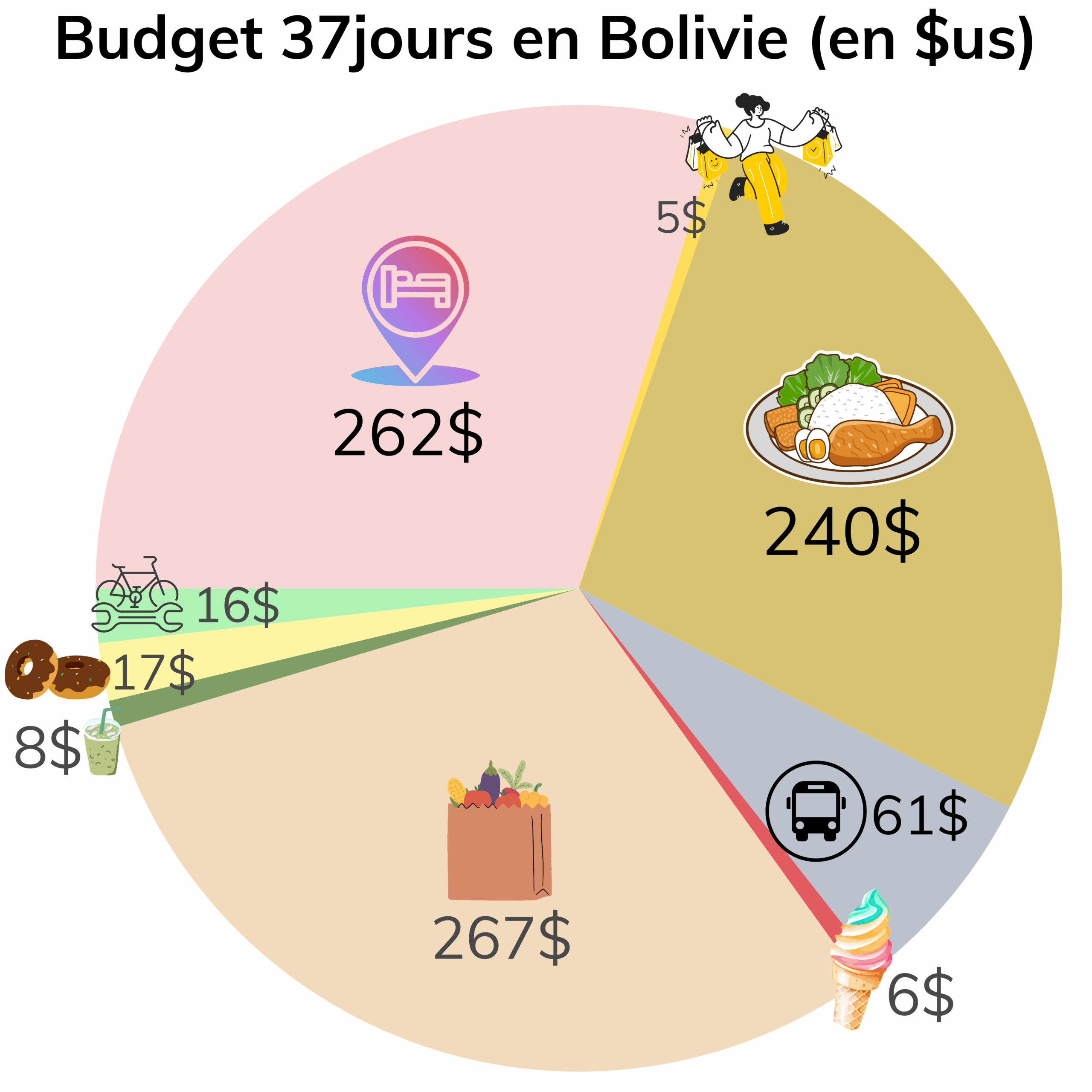 Notre budget pour ces 6 mois en Amérique du sud est de 40$cad par jour pour 2 (soit 28.5$us ou 24.5€). En Bolivie, nous avons été capables de tenir ce budget, même en se faisant très plaisir au niveau de la nourriture, notamment à La Paz où nous avons fait une cure de plats exotiques (indien, burger, pizza, restaurant gastronomique, etc.).